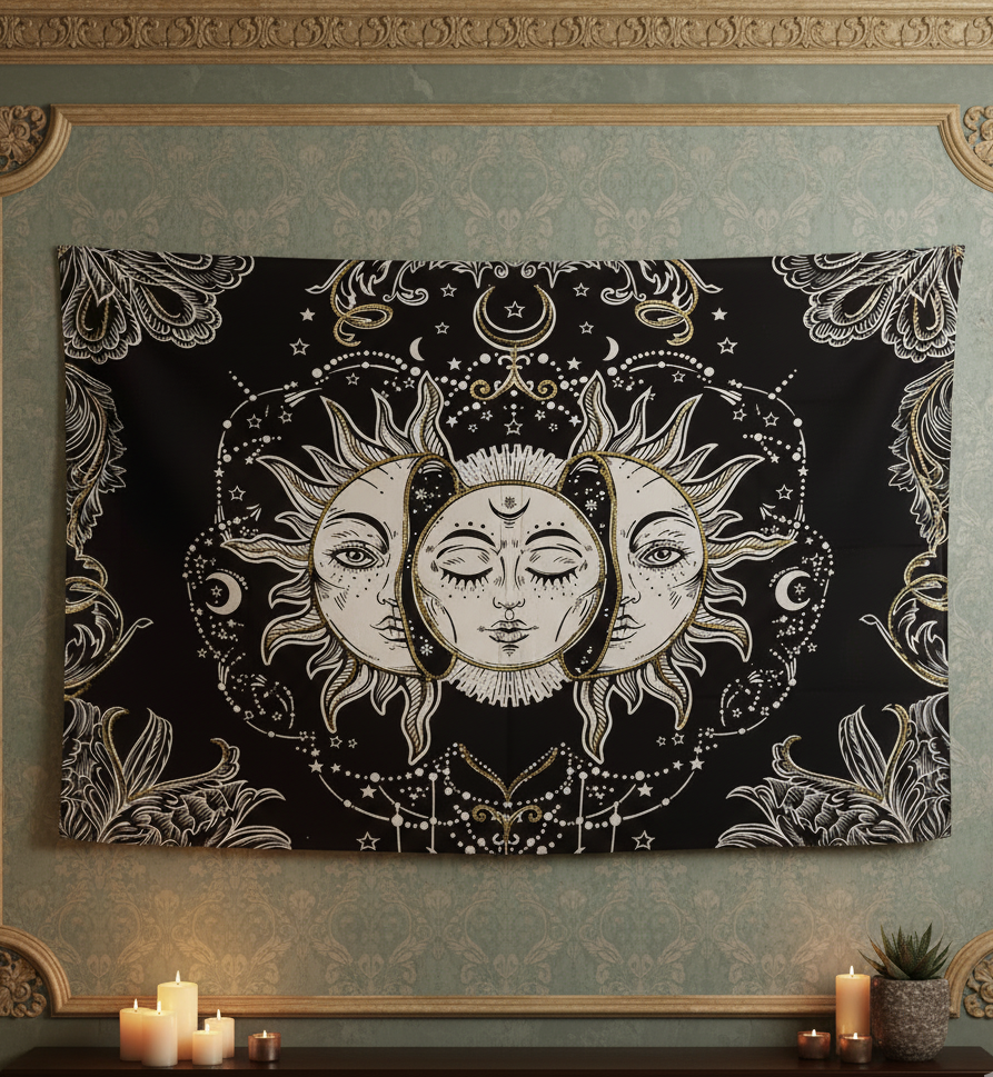 Ideal para salón, dormitorio, sala de yoga o meditación, este tapiz crea un punto focal impresionante y una atmósfera acogedora. Su tonalidad neutra permite que se integre armoniosamente en diversas paletas de colores, mientras que su temática solar infunde al ambiente una sensación de optimismo y bienestar. Fácil de colgar, es la solución perfecta para añadir personalidad y un toque espiritual a tu hogar.