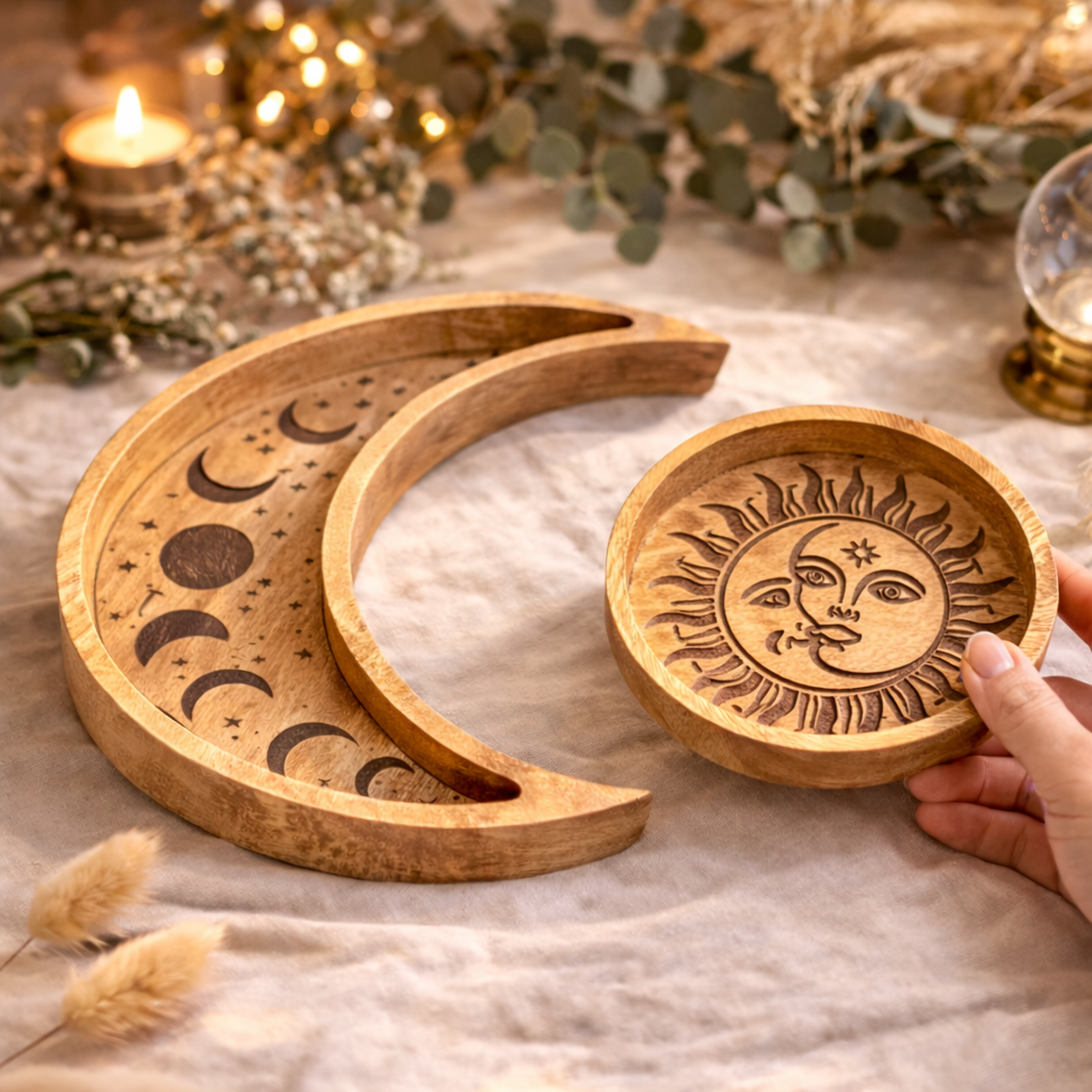 Añade una chispa celestial a tu hogar con este Juego de Bandejas de Sol y Luna. Talladas artesanalmente en madera de mango, este conjunto de 23 cm incluye una bandeja circular con grabado solar y una bandeja encajable en forma de luna creciente. Perfectas para organizar tus cristales, joyas o velas, aportando un estilo místico y artesanal a cualquier rincón.