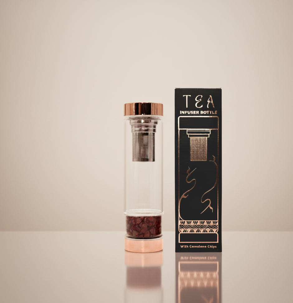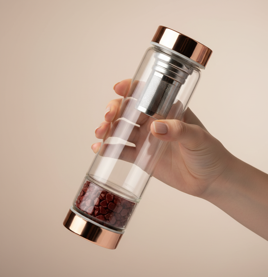 💎 Botella de Cristal para Té con Jaspe Rojo y Oro Rosa: Energía y Vitalidad