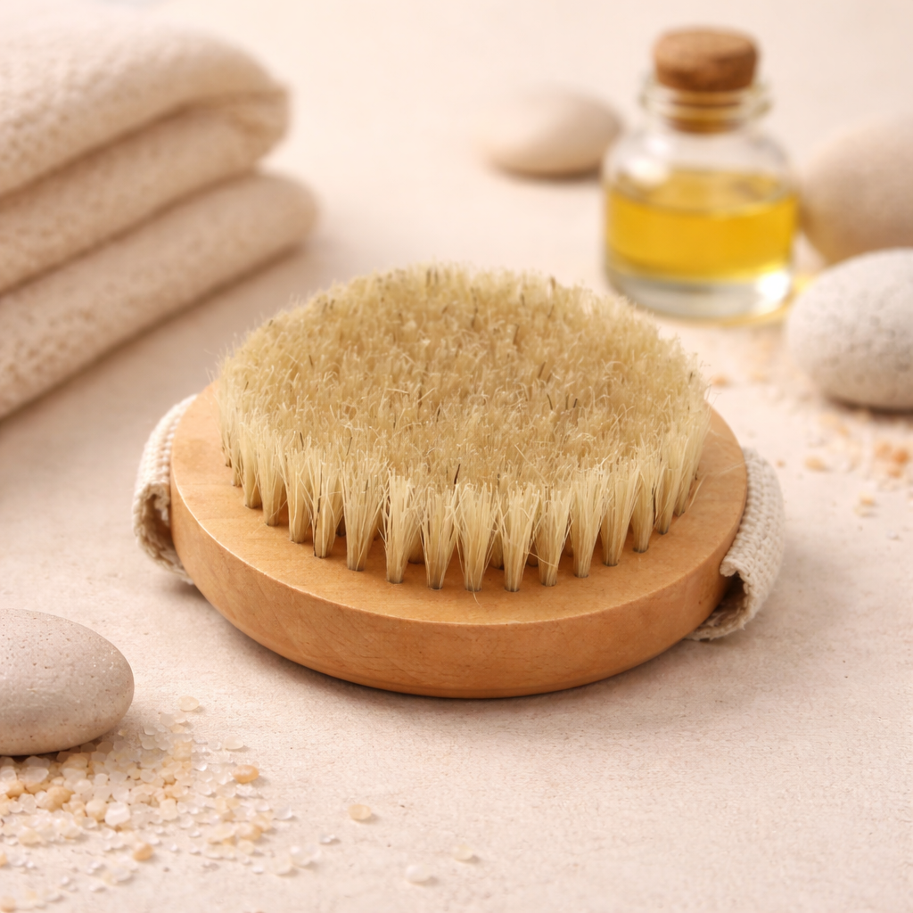 Técnica de Dry Brushing: Utilizado en seco antes del baño, ayuda a activar la circulación sanguínea y favorece el drenaje linfático, siendo un excelente apoyo para reducir la retención de líquidos.