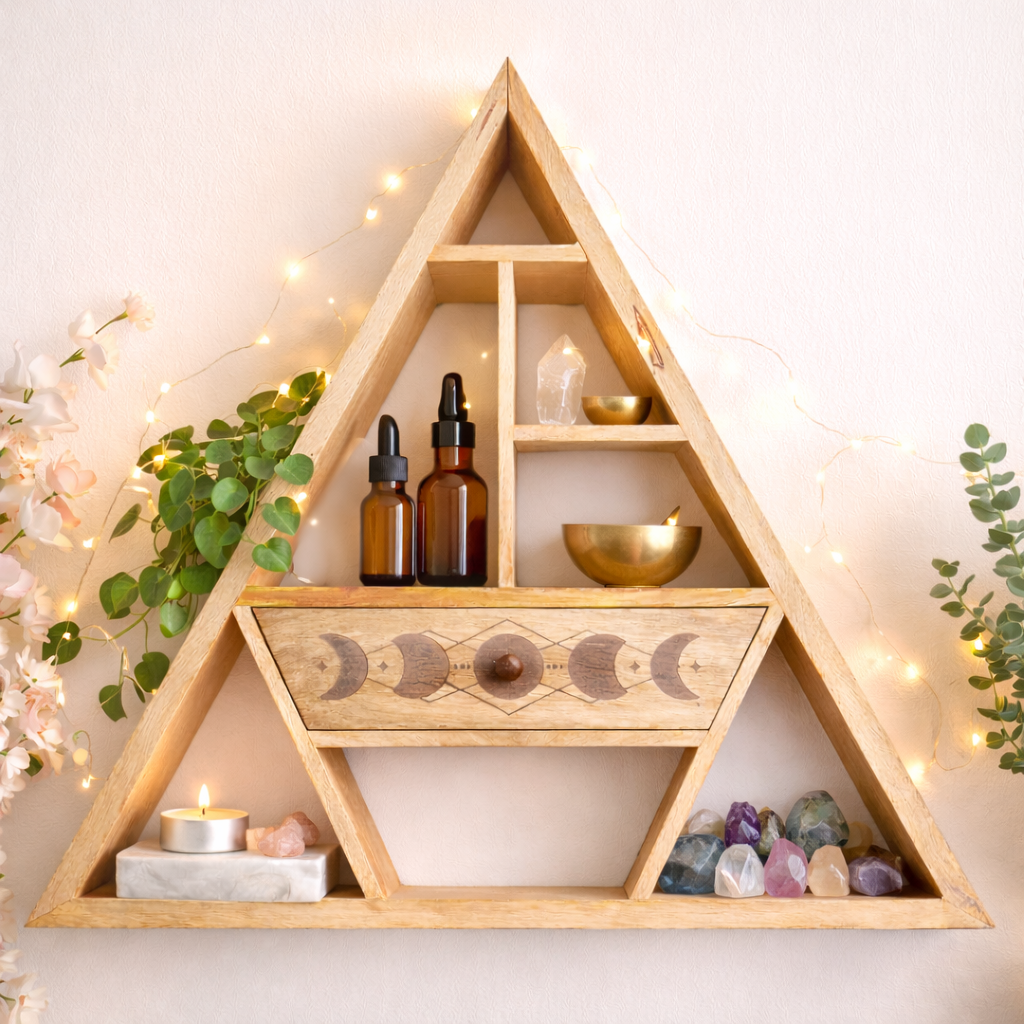 Exhibición Abierta: Los niveles laterales son ideales para colocar tus puntas de cuarzo, barajas de tarot, aceites esenciales o pequeñas plantas, manteniéndolos siempre a la vista y con buena energía.