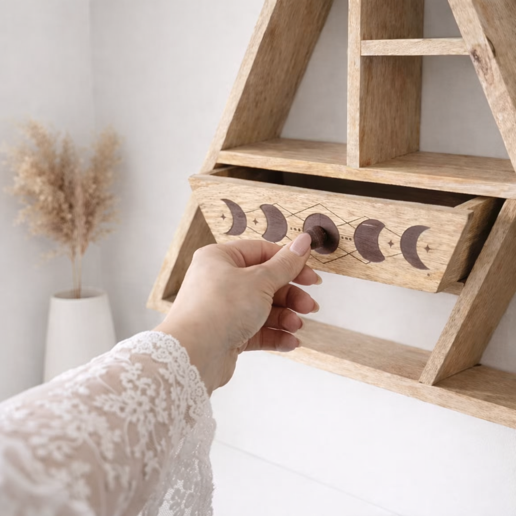 Diseño Celestial y Almacenamiento Sagrado Este estante ha sido pensado para quienes valoran la estética boho, espiritual y moderna: