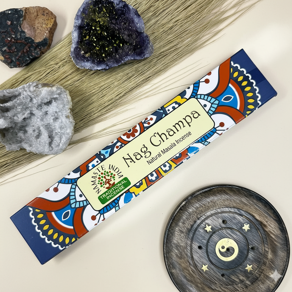 Sumérgete en el aroma icónico y espiritual del Incienso Namaste Mandala Masala – Nag Champa. Elaborado artesanalmente con una mezcla secreta de hierbas, resinas, flores y aceites naturales, siguiendo la auténtica tradición Masala, este incienso ofrece la fragancia original de Nag Champa. Es un aroma complejo, dulce, floral y ligeramente especiado, conocido por sus propiedades para la meditación, la purificación y para crear una atmósfera de paz y devoción.