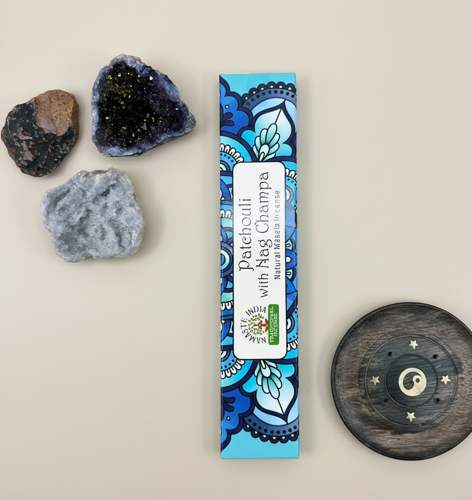 Incienso artesanal Masala de Pachulí y Nag Champa. Aroma terroso y místico, ideal para meditación profunda, purificación y crear ambientes exóticos y espirituales.
