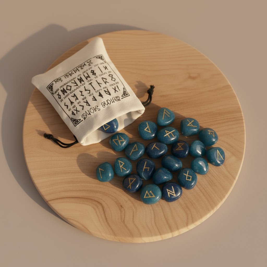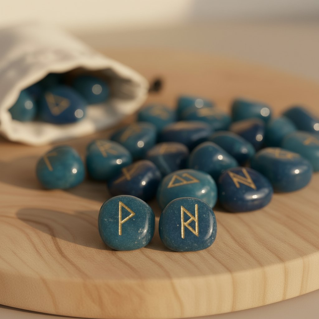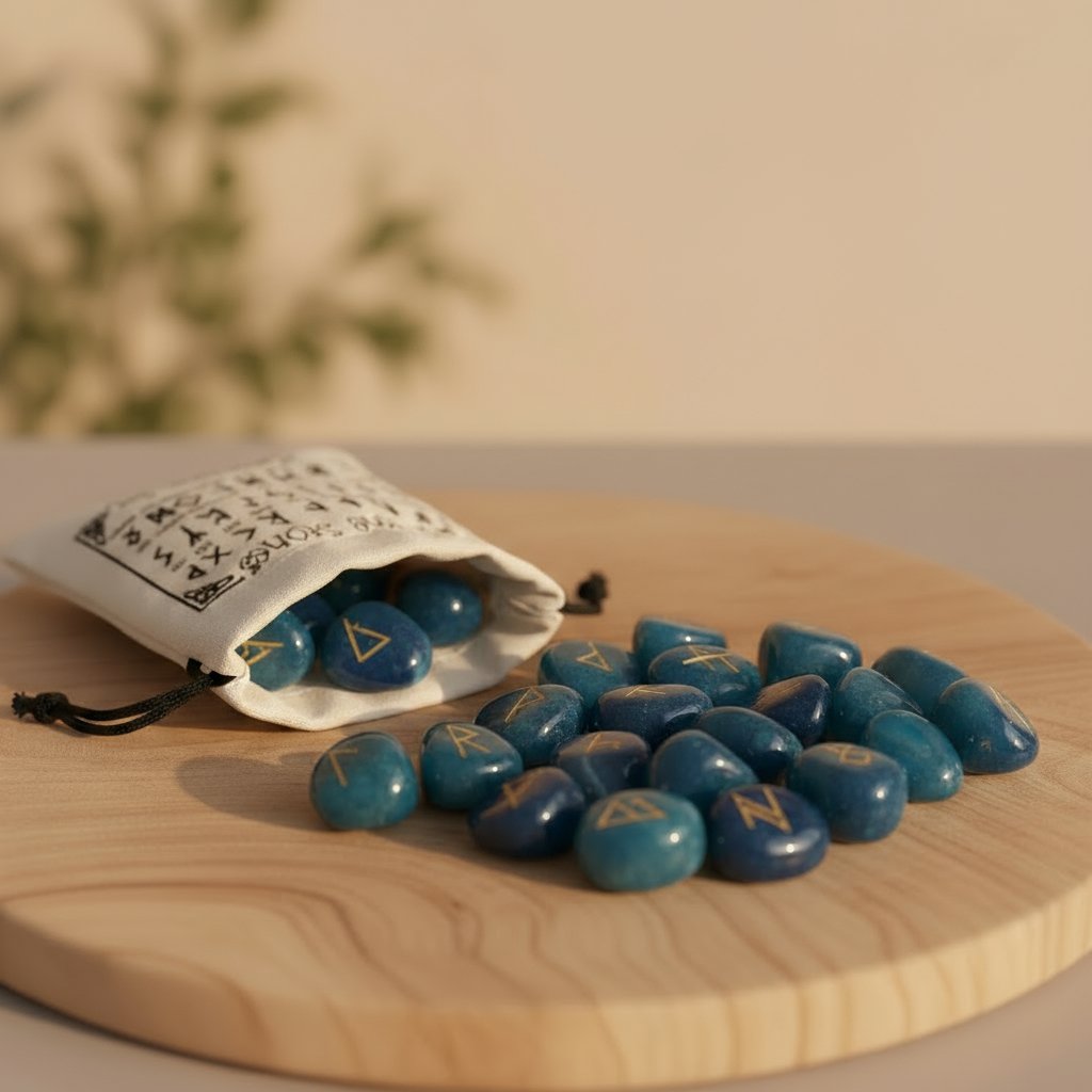 Incluye 25 runas de ónix azul natural grabadas y doradas.