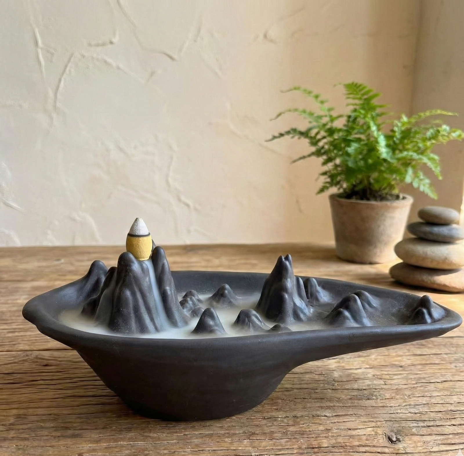 Cuando se enciende un cono de incienso de reflujo (necesario para este quemador), el humo desciende suavemente a través del diseño, creando un efecto hipnótico que simula una cascada de humo mágica fluyendo a través de un sereno paisaje de montaña.