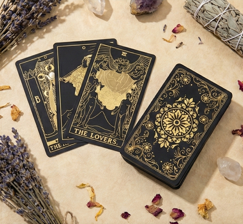 La baraja fusiona el simbolismo clásico del tarot RWS (Rider-Waite-Smith) con un impactante diseño. El contraste entre el negro profundo y la lámina dorada le otorga un aspecto atrevido, místico y visualmente hipnótico. Es una herramienta poderosa para la adivinación y la introspección.