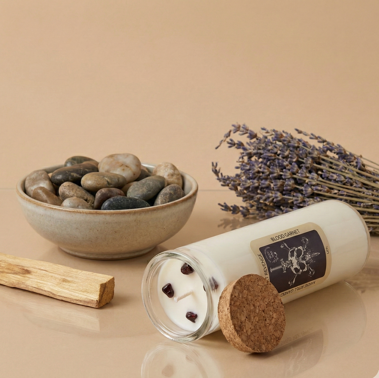La eficacia de esta herramienta reside en su dualidad simbólica. Para empezar, la vela contiene piedras de Granate (Blood Garnet), una gema reconocida por aportar coraje, vitalidad y protección contra la envidia ajena. Además, la fragancia de Lirio (Lily) envuelve el ambiente con notas frescas que simbolizan la pureza de intención y la paz tras la tormenta.