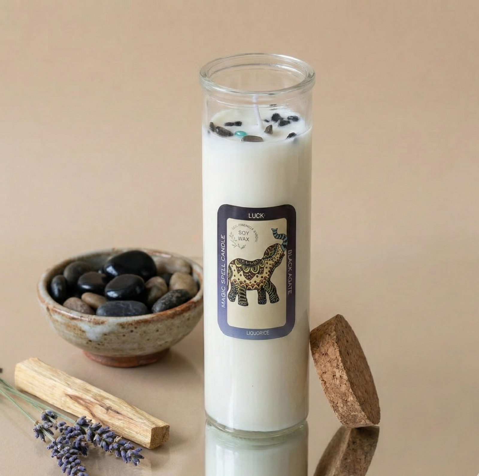 Ingredientes: Cera de soja natural, aceites esenciales de regaliz, piedras de ágata negra auténticas.